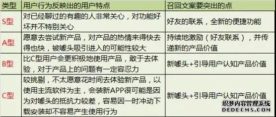 根據(jù)上面兩張表格,不難發(fā)現(xiàn):S型用戶(通話時(shí)長(zhǎng)3h ):在應(yīng)用內(nèi)已經(jīng)沉淀了人際關(guān)系,相對(duì)于對(duì)軟件的功能要求,更加關(guān)心好友。對(duì)其要利用社交關(guān)系,讓TA們知道還有很多朋友在等著TA。所以對(duì)其輸出的召回短信文案是:“你好久沒上【XXXX】啦。可知你不在的這段日子里,錯(cuò)過了7個(gè)電話12個(gè)留言紅包?快升級(jí)最新版聯(lián)系他們吧!”