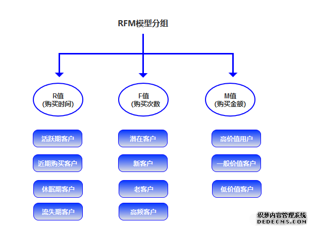 對于短信營銷,常用的就是FRM模型分組的方式,如下圖,然后有效組合下圖的R值、F值、M值三個條件,再結合一些細分的分組條件來細分客戶,做更加精準的營銷,提升短信的效果,提升ROI等;