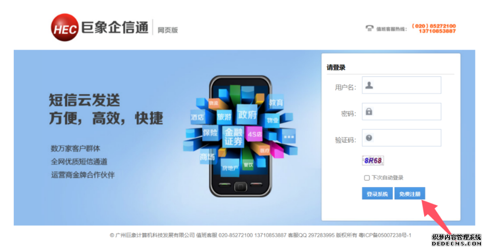 需要使用的用戶可自行登錄網頁sms.hechina.cn免費注冊一個專用賬戶,聯系我司客服注冊一個專用賬戶。