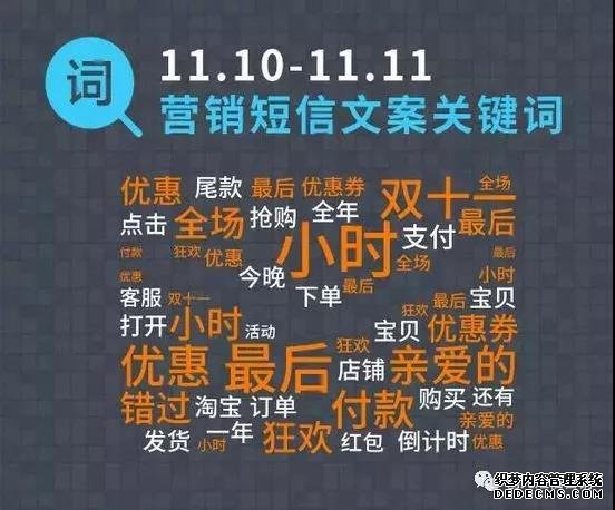 雙十一當(dāng)天短信營(yíng)銷文案關(guān)鍵詞Top榜是「小時(shí)」、「倒計(jì)時(shí)」、「雙十一」、「最后」、「錯(cuò)過」等。