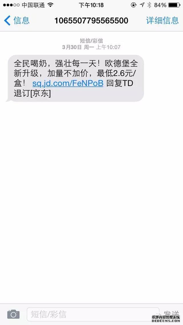 高效率是指的達率高。你可以不看微博,不關注企業的微信號,但不管收到什么短信都會掃一眼吧,很多時候有這一眼就夠了,如果短信文案寫得吸引人,能讓人有多看幾眼、甚至有點擊鏈接的欲望,這不是皆大歡喜嘛。而短信的號碼,則通常是已經注冊過產品的賬號綁定的手機號,或者購買的對應垂類用戶信息,做精準推廣。