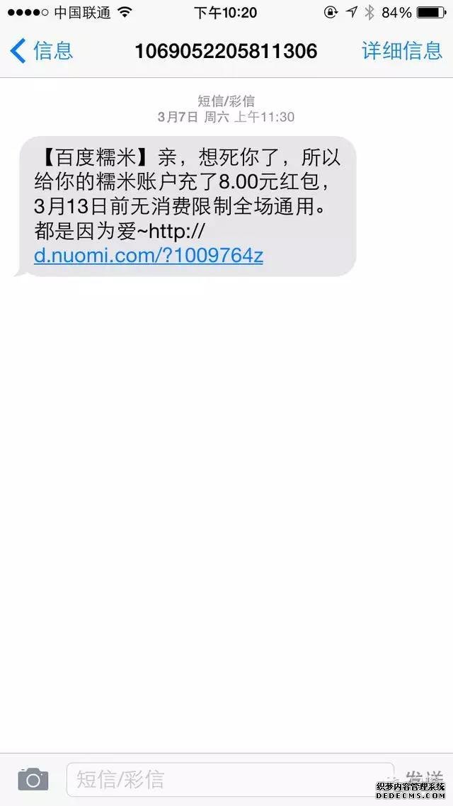 如果換成:“親,想死你了,所以給你的糯米賬戶充了8元紅包……”短信收到時的提示也就顯示這么長了,這種內容被打開的幾率是不是大一些?