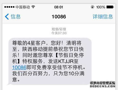 3月30日早上7時16分,還沒有起床的李女士收到陜西移動10086發來的短信,內容為:“尊敬的4星客戶,您好!清明將至,陜西移動提前恭祝您節日快樂!同時邀請您尊享【節假日免停機】特權服務,發送KTJJR至10086即可免費享受佳節不停機....。.”“竟然收到清明節祝福的短信,這條短信看得人太郁悶了。”李女士說。