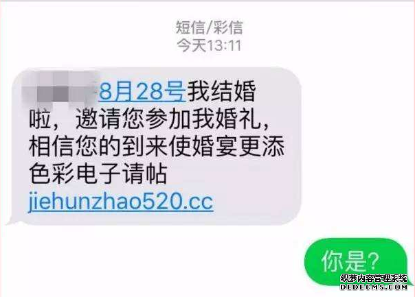 一到5.1,10.1各種婚禮請帖就如潮水般涌來。最近騙子開始打起了請帖的主意。通過偽基站短信群發以下信息: